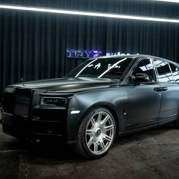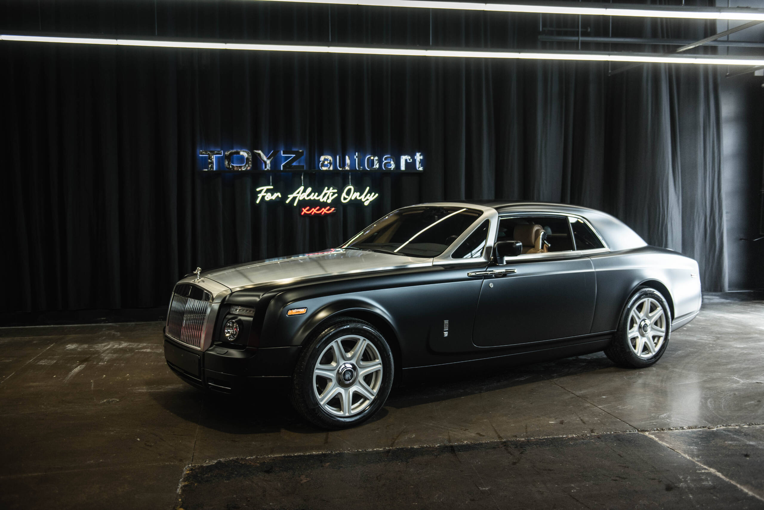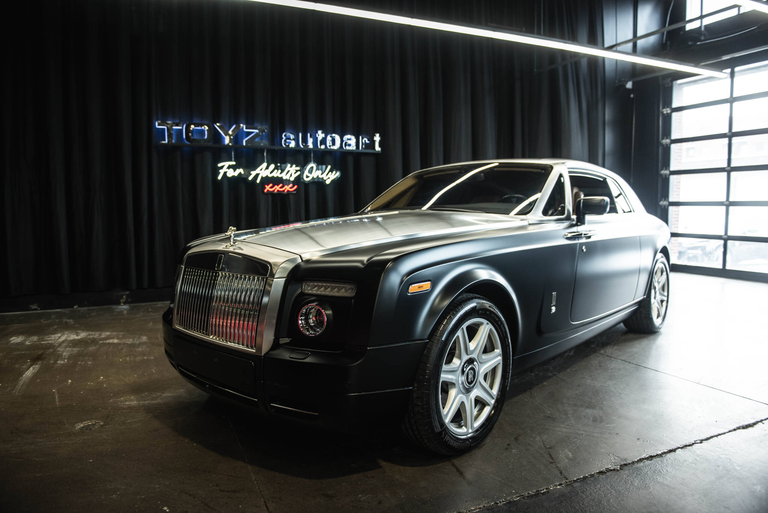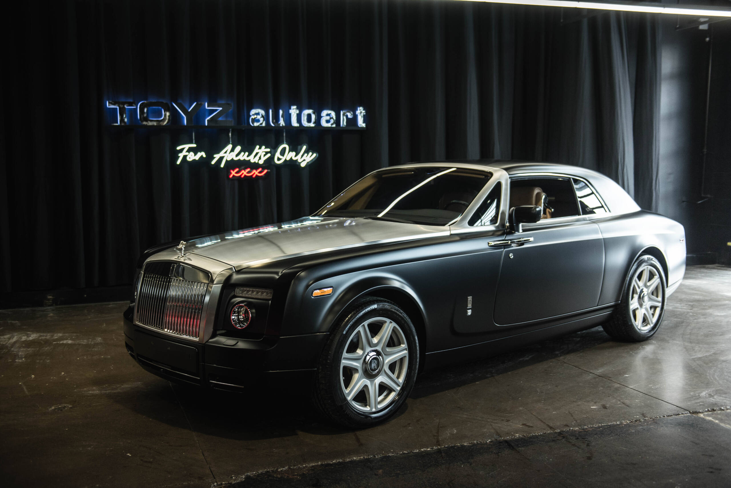 TOYZ autoart is pleased to bring you this 2009 Rolls-Royce Phantom Coupe is finished in gloss black paint that has been covered with a satin paint-protection film, giving the car a muted, modern appearance while preserving the factory finish beneath. The car is powered by a 6.75-liter naturally aspirated V12 paired with a six-speed automatic transmission driving the rear wheels.