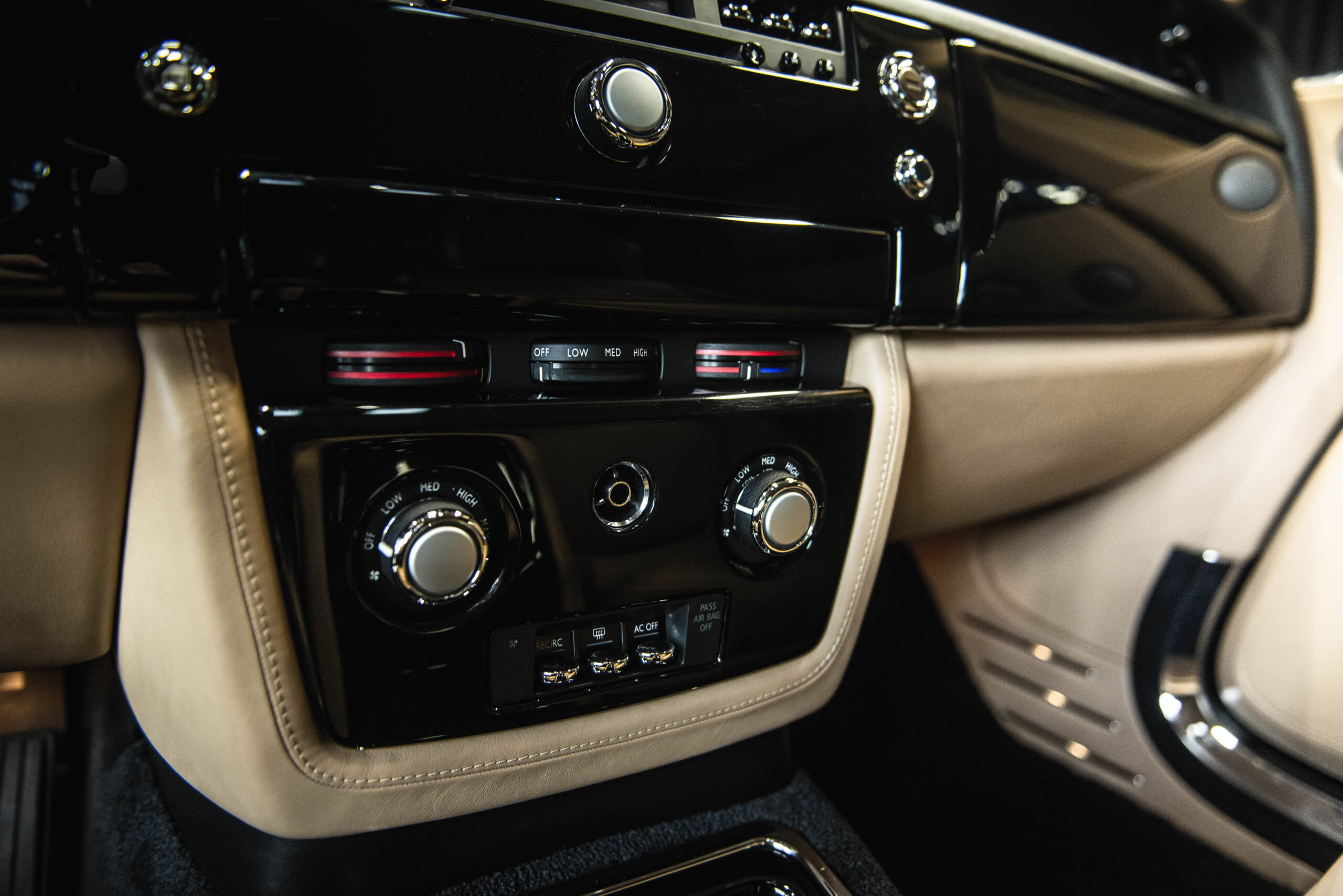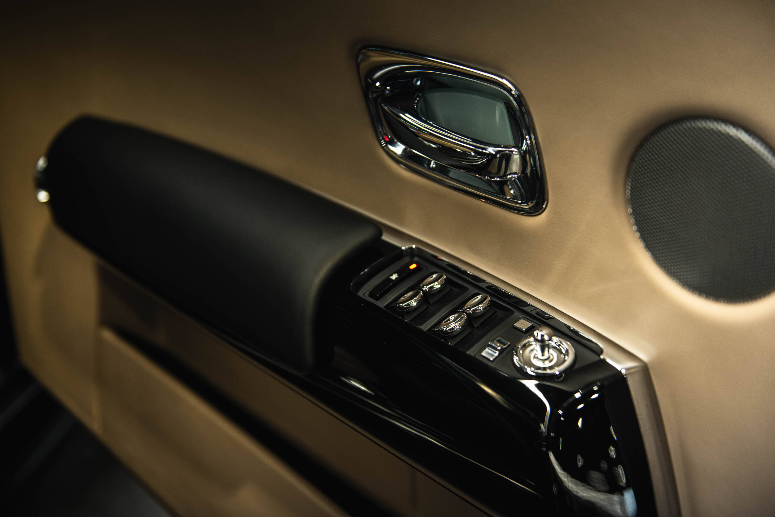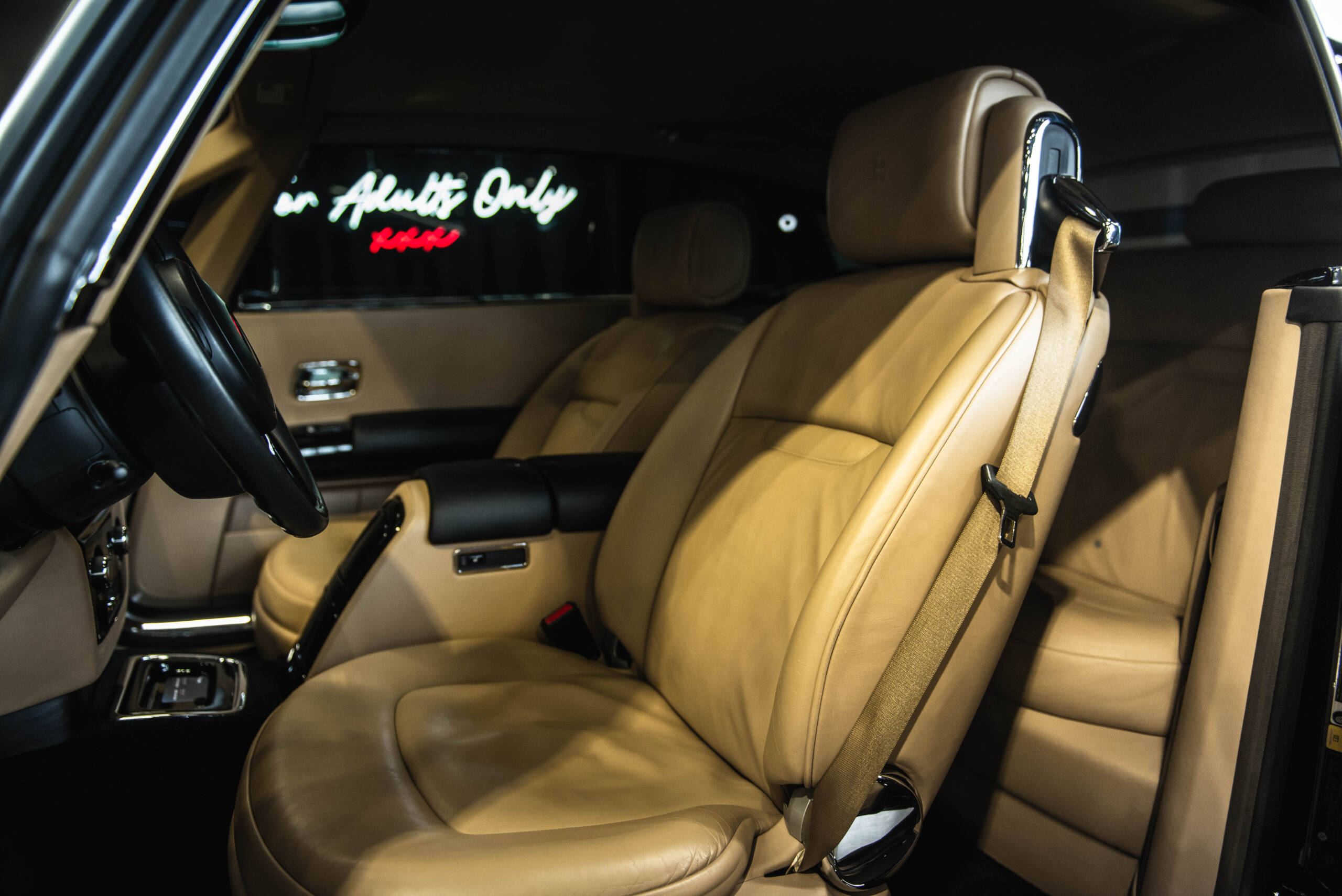 The interior features leather upholstery, wood veneer trim, deep-pile carpeting, and a dashboard-mounted infotainment display. Additional amenities include power-adjustable seating, automatic climate control, and Rolls-Royce’s signature attention to materials and craftsmanship.
