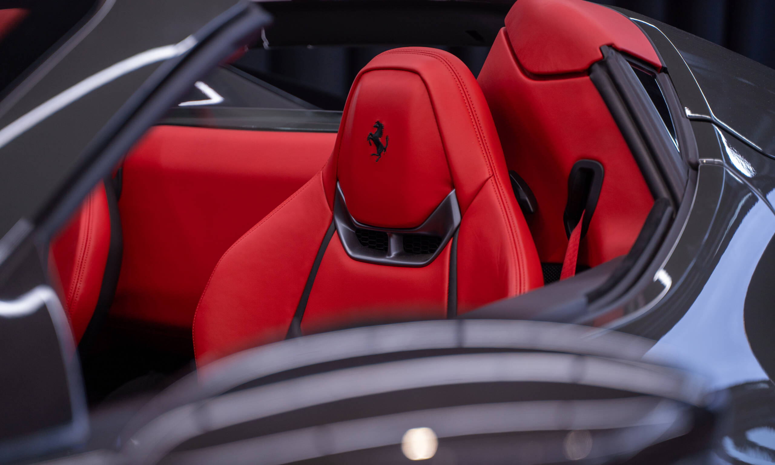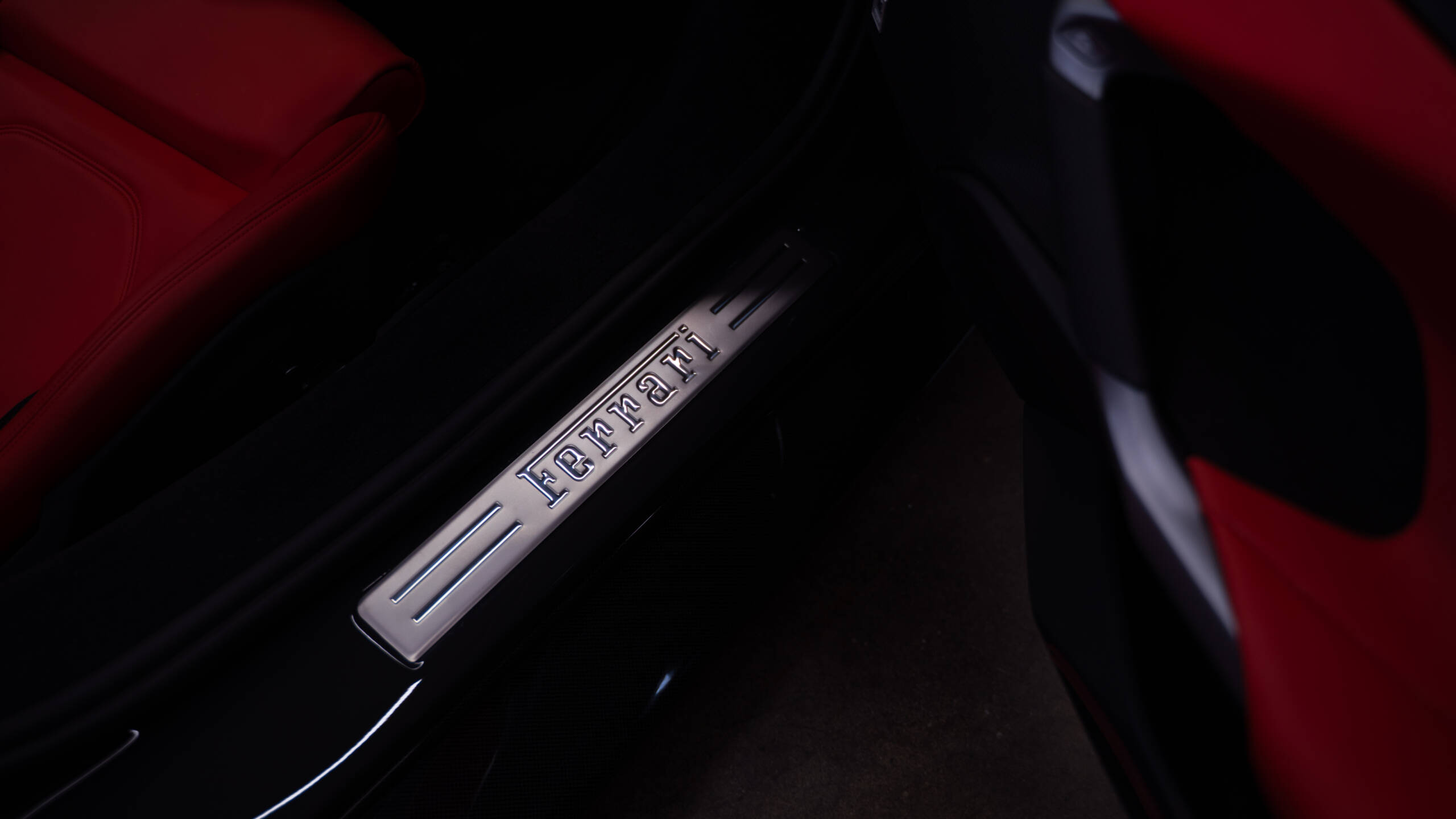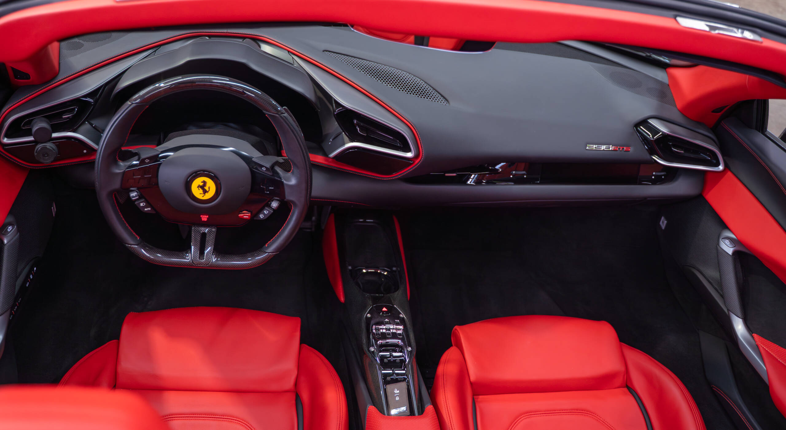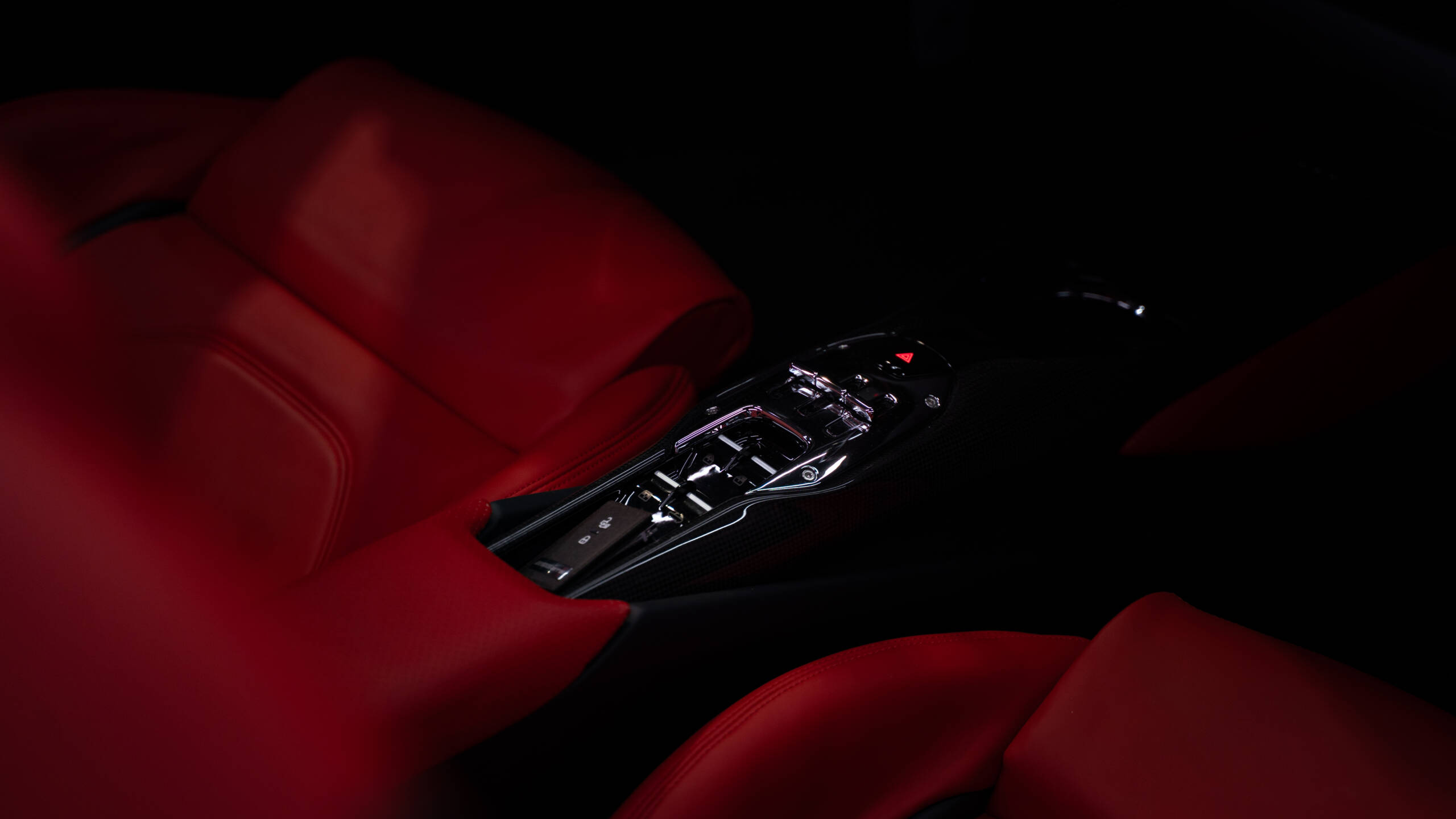The cabin has been reworked with a focus on elevated materials and a more cohesive Ferrari-inspired color scheme. Additional leather has been applied to high-touch and visual areas including the pillars, door panels, center console, and rear bulkhead behind the seats. Rosso Corsa red accents have been expanded throughout, enhancing the contrast and giving the interior a more bespoke, driver-focused feel.