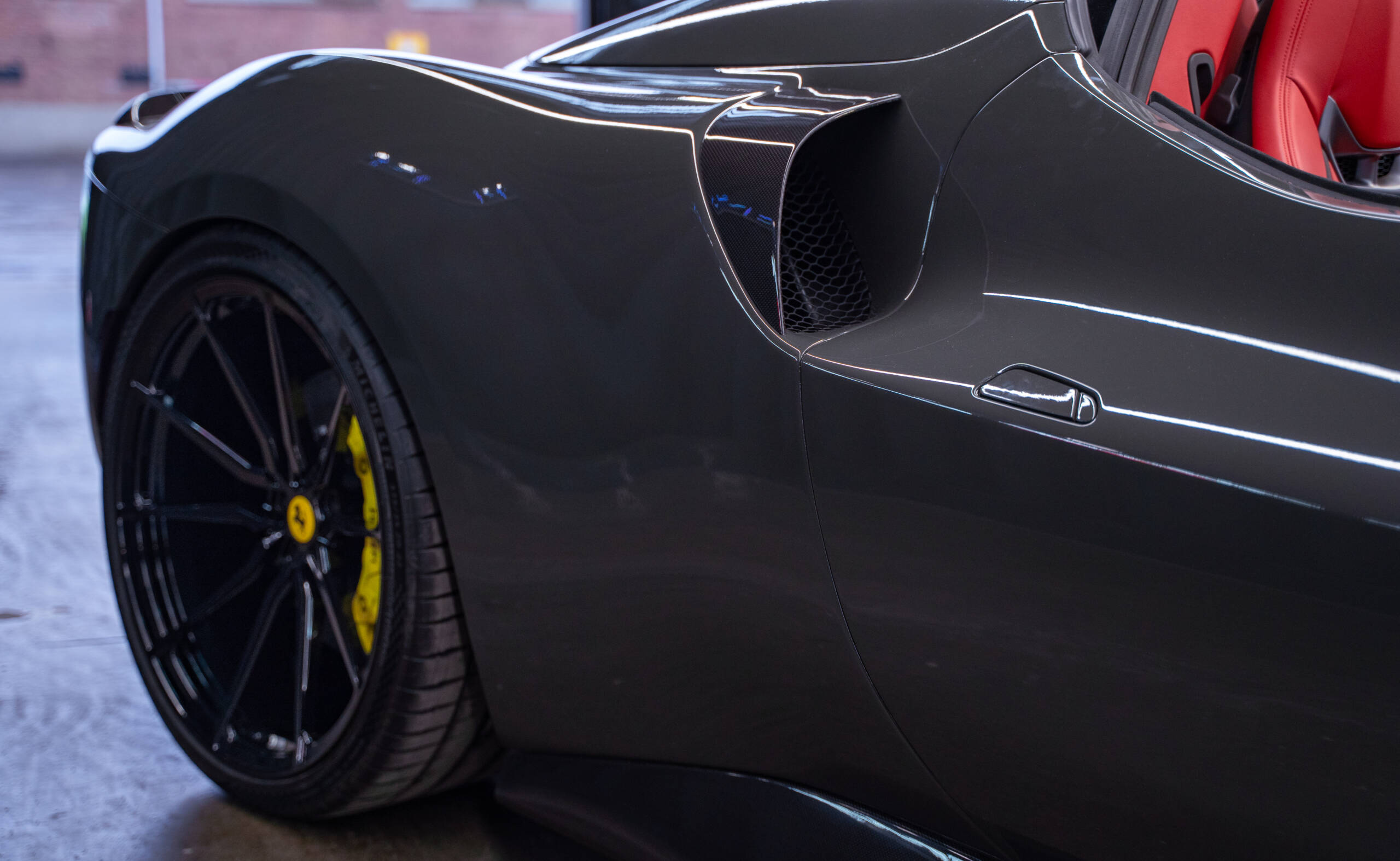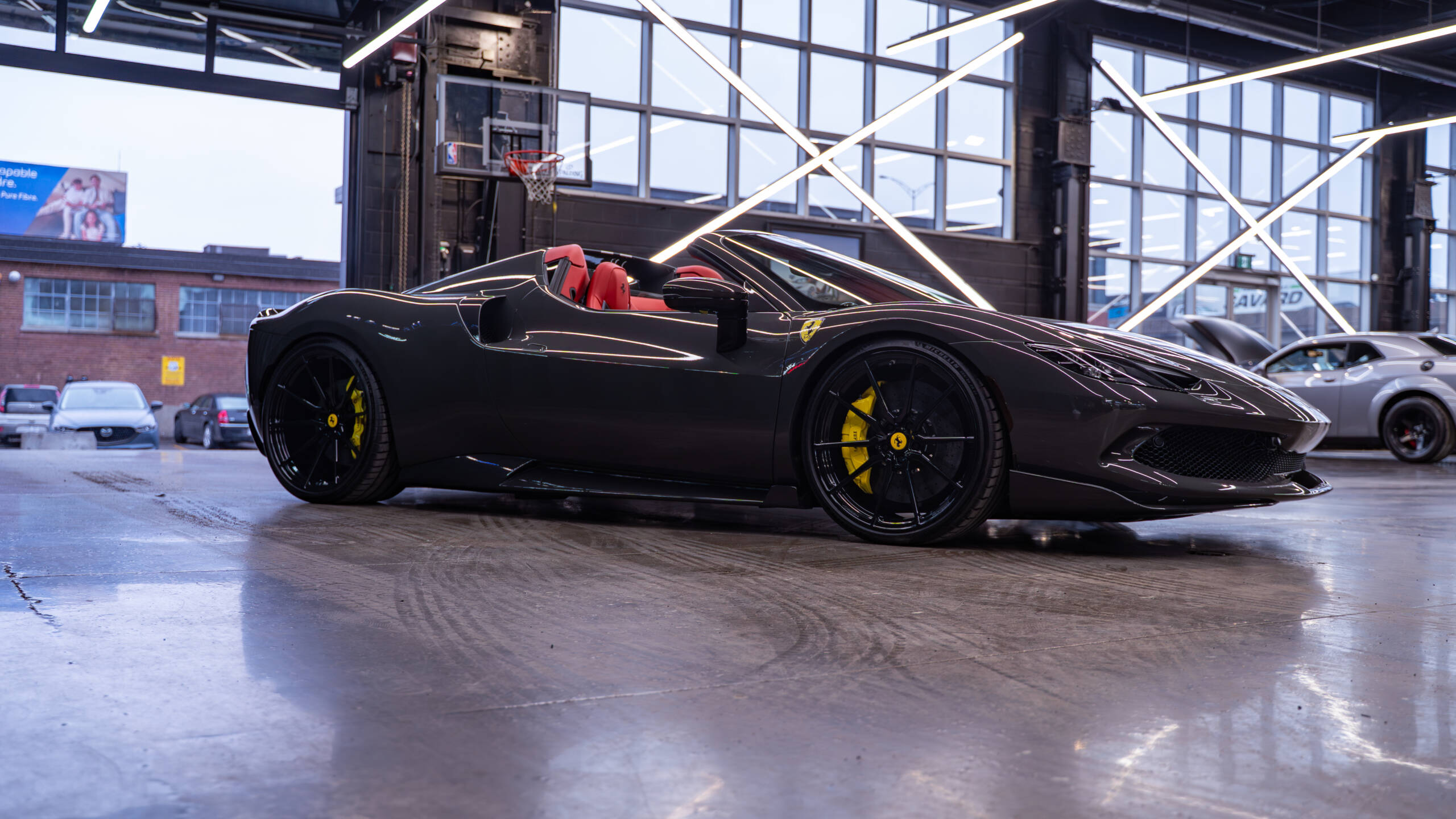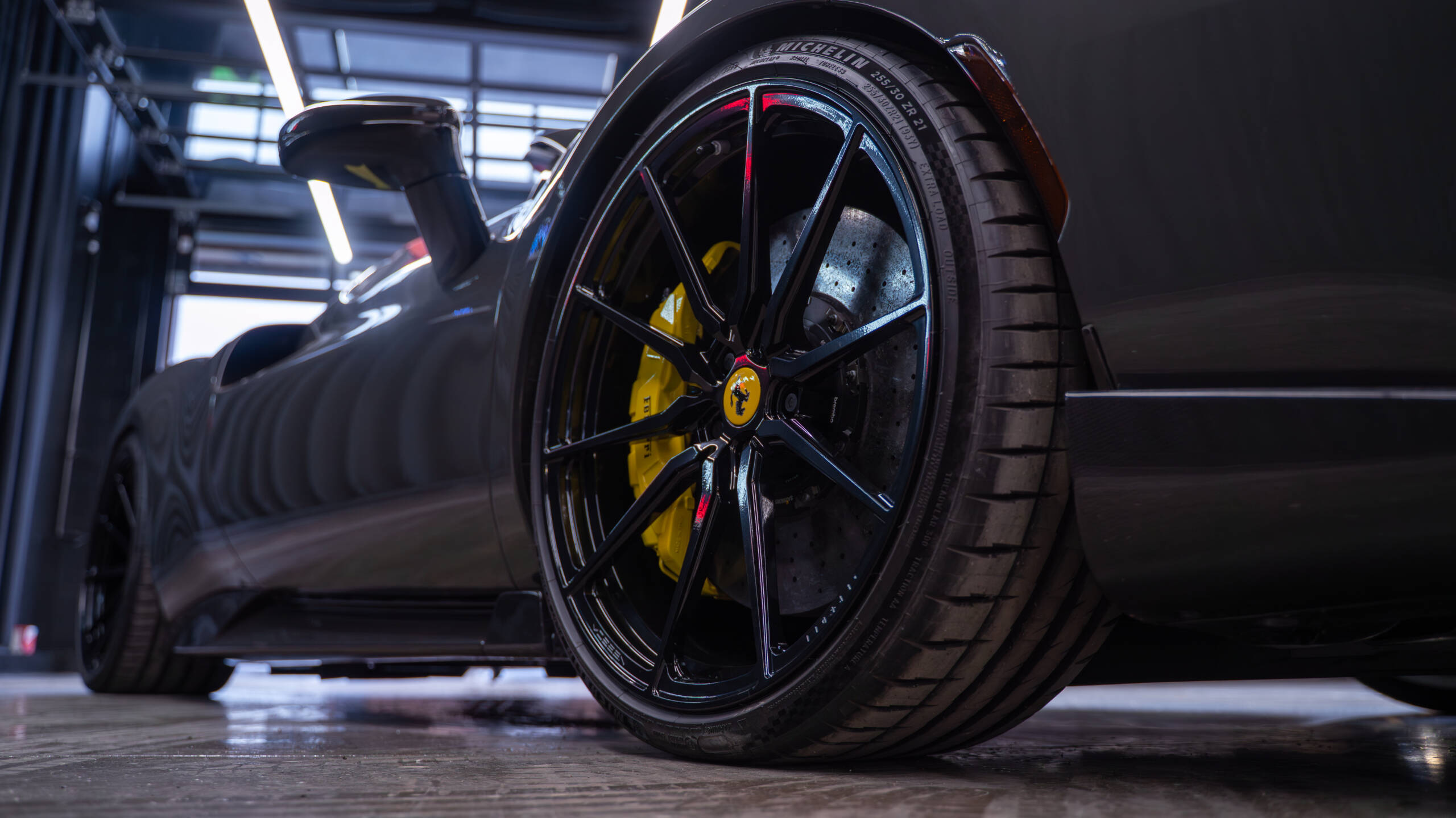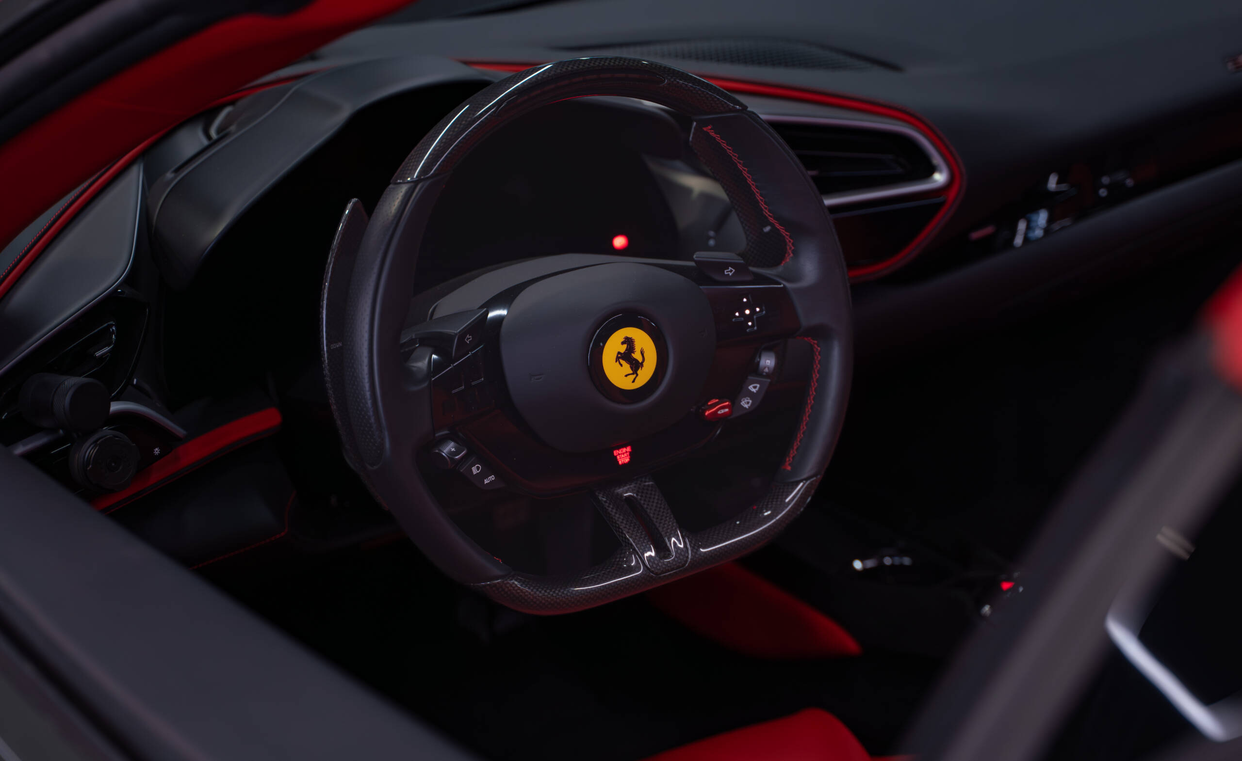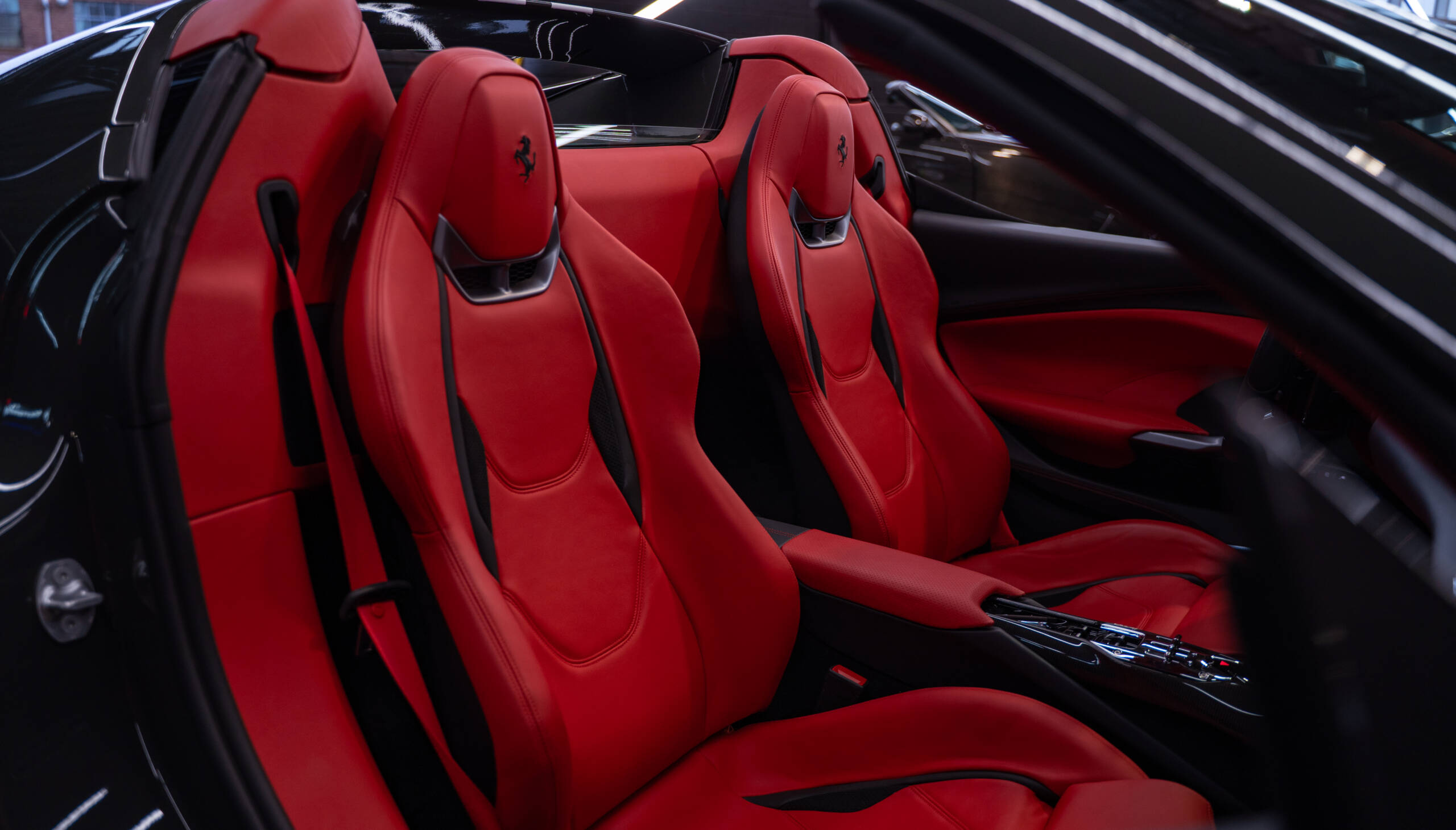 The cabin has been reworked with a focus on elevated materials and a more cohesive Ferrari-inspired color scheme. Additional leather has been applied to high-touch and visual areas including the pillars, door panels, center console, and rear bulkhead behind the seats. Rosso Corsa red accents have been expanded throughout, enhancing the contrast and giving the interior a more bespoke, driver-focused feel.